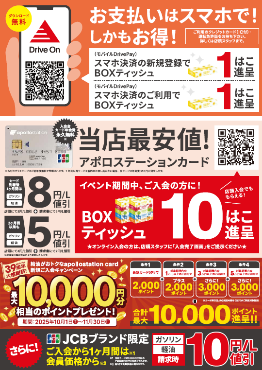 アポロステーションカードの新規ご入会で、なんとティッシュ10箱を進呈いたします!!!